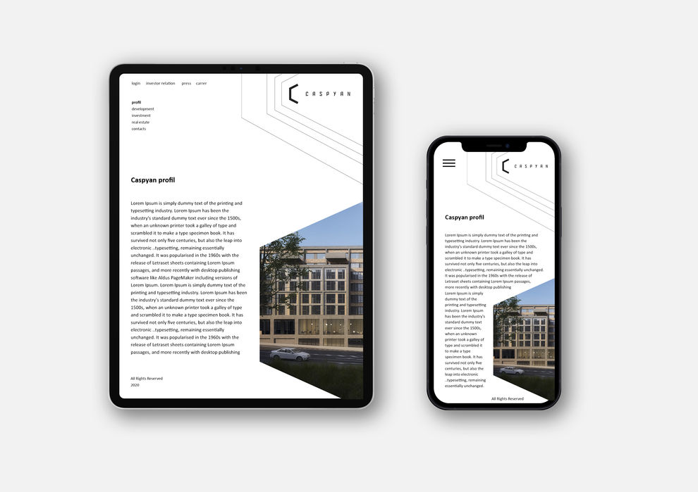 Visual identity for a holding company involved in developing projects. The initial C is stylised into a geometric element, followed by other graphic principles - directional lines and slanted shapes. The design is minimal and discreet.